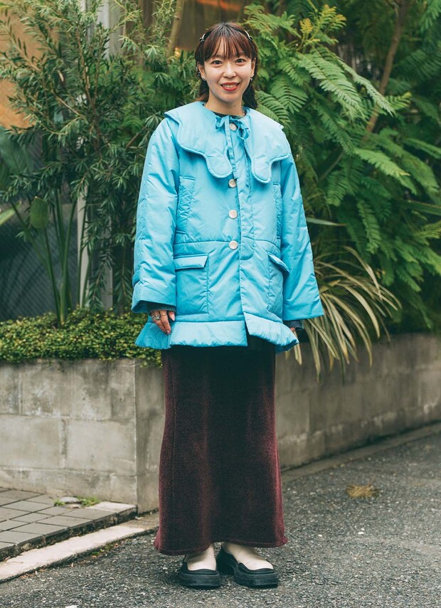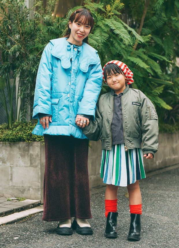 重たくなりがちな冬のコーディネートに、鮮やかなブルーとレッドでライトに仕上げ! ママの波打つシルエットのアイテムやキッズのストライプ柄と、楽しげなアクセントをつけたのがポイント。