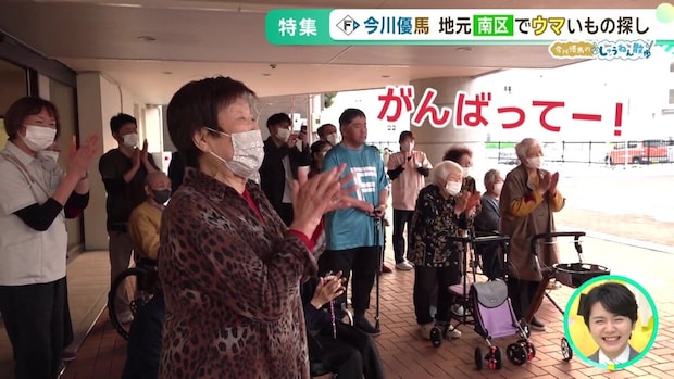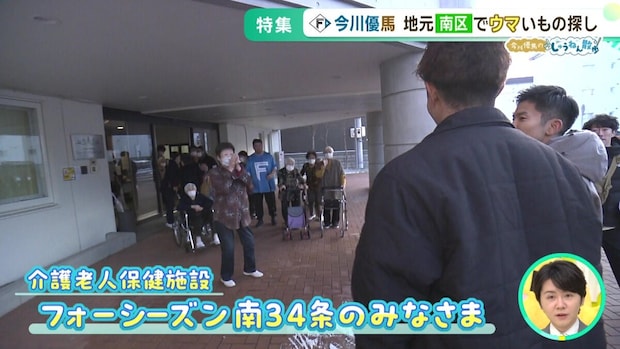 歩いていると、介護老人保健施設「フォーシーズン南34条」の皆さんが外で出迎えてくれるというサプライズが。ファイターズのTシャツを着て待っていたファンもおり、今川選手は一人ひとりとハイタッチ。