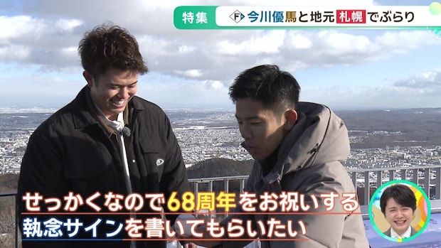 展望台では、今年で運行開始から68周年を迎える「札幌もいわ山ロープウェイ」をお祝いし、記念のサインボールを贈呈。「しゅうねん(周年)」という言葉に敏感に反応し、力強く「68執念」と書き込む姿に、新年早々、並々ならぬ気合が感じられました。