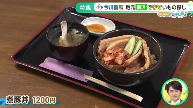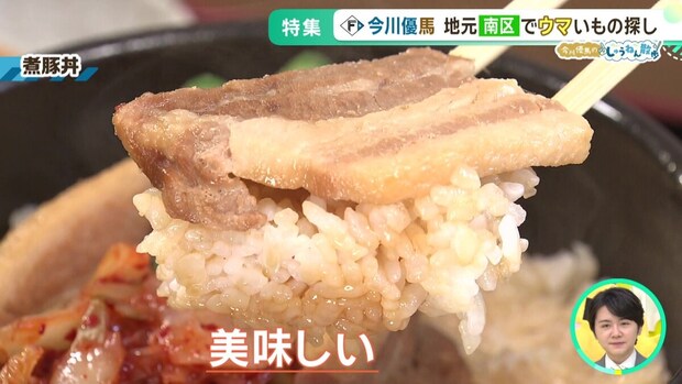 煮豚丼: 厚さ8ミリの豚バラ肉が何枚も重なり、キムチとの相性も抜群。