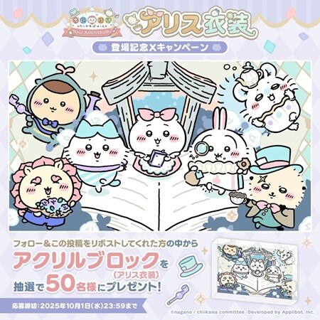 また、同アカウントをフォロー&リポストで、抽選で50名に「ちいぽけ」オリジナルグッズ「ちいぽけアクリルブロック(アリス衣装)」が当たるキャンペーンを実施。