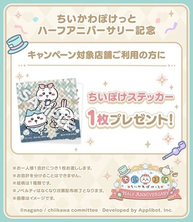 10月8日(水)各店舗開店時〜16日(木)に全国の対象店舗で配るステッカーの絵柄と対象店舗を公開。同ステッカーはなくなり次第終了となる。対象店舗は、ちいかわらんどの大阪梅田店、原宿店(リニューアルオープン後の配布開始)、福岡パルコ店、京都四条河原町店、TOKYO Station、東京スカイツリータウン・ソラマチ店、名古屋パルコ店、仙台パルコ店、札幌パルコ店、マルイシティ横浜店、広島パルコ店、心斎橋パルコ店、新宿店。