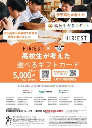 今回、「ハーベスト」の新たな展開として愛媛県立伊予高等学校の生徒が主体となり、愛媛県松前町の地域企業と連携し、地元特産品を中心に集めたカタログギフト「伊予高校×『ハーベスト』選べるギフトカード」5,000円(税・送料込み)を企画・制作して、9月23日(火)より販売がスタートした。