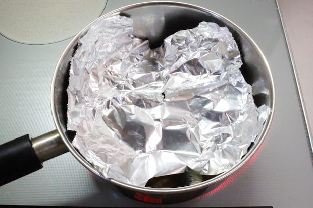 4. 1のしょうが、2、半分にちぎった梅干しを種ごと入れ、アルミホイルの落としブタをして沸騰させてから弱火で15分ほど煮ます。