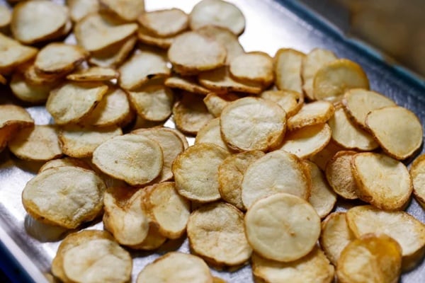 「五四◯」を真空フライ加工した野菜菓子「倶揚げ」とキャラメル風味のチョコレートを混ぜ合わせ、中には、江丹別(北海道旭川市)の青いチーズのガナッシュとセロリ塩を閉じ込めている。「五四◯」を真空フライ加工した野菜菓子「倶揚げ」が、お菓子とコラボするのは初めてだ。