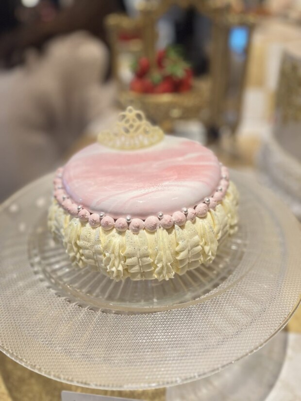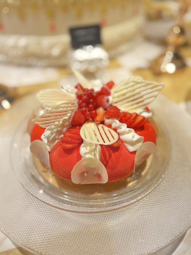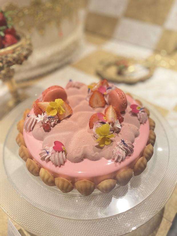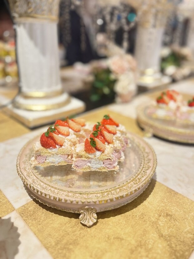 スイーツ台にはマリー・アントワネットの出身地であるオーストリアの伝統菓子「カーディナルシュニッテン」やドイツの伝統菓子「クランツ」などもイチゴを使って華やかにアレンジした。また、ファッションアイコンとしても名を馳せたマリー・アントワネットらしいドレスやジュエリーをモチーフにしたミニケーキなども用意した。