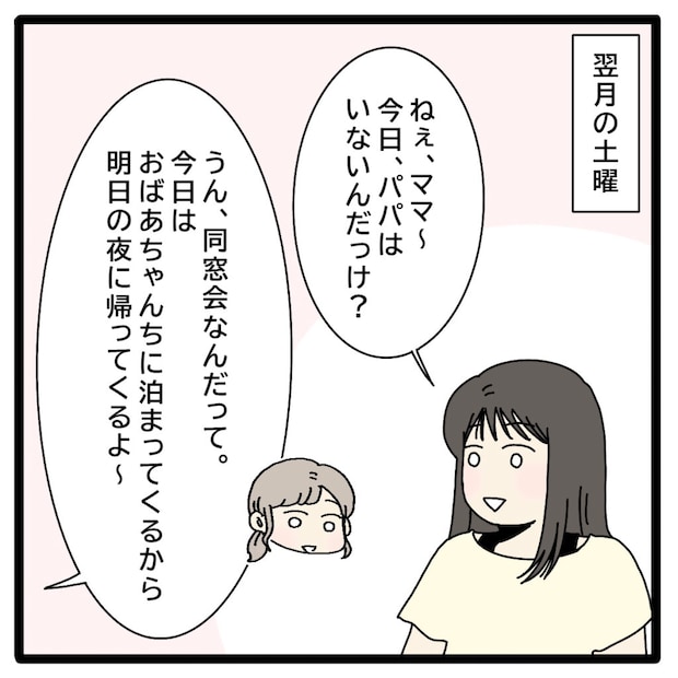 そして翌月の土曜日。正志の同窓会の日です。「ねぇ、ママ~。今日パパはいないんだっけ?」とリマが聞くので「うん、同窓会なんだって。今日はおばあちゃんちに泊まってくるから、明日の夜に帰ってくるよ~」と答えました。