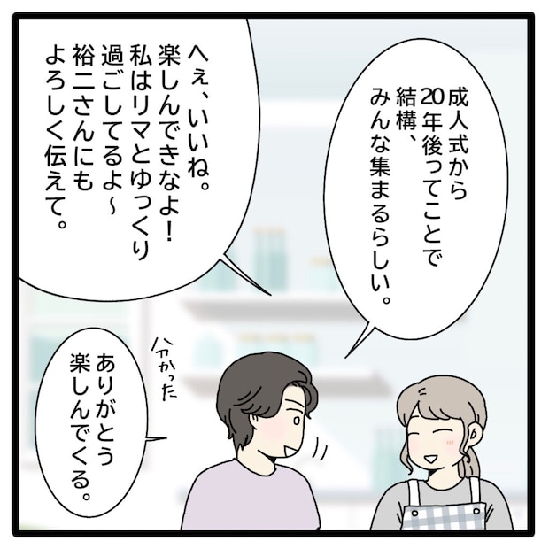 「成人式から20年後ってことで、結構みんな集まるらしい」と嬉しそうに話す正志に「へぇ、いいね。楽しんできなよ!私はリマとゆっくり過ごしてるよ~。裕二さんにもよろしく伝えて」と笑顔で伝えると、「ありがとう。楽しんでくる」と正志も喜んでいました。