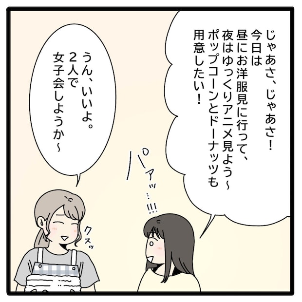 すると、「じゃあさ、じゃあさ!今日は昼にお洋服見に行って、夜はゆっくりアニメ見よう~!ポップコーンとドーナツも用意したい!」といつもと違う週末にワクワクして目を輝かせるリマ。そんなリマを微笑ましく思いながら「うん、いいよ。2人で女子会しようか~」と私も笑顔で答えました。