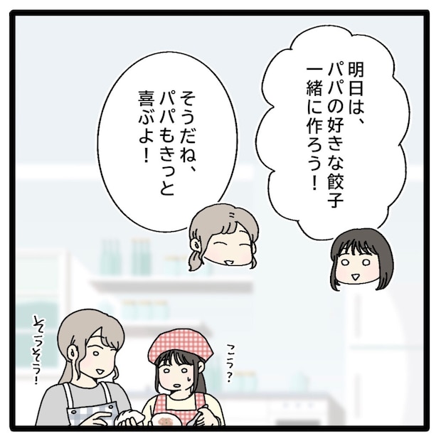 家族みんなが笑顔で、夫婦仲も親子仲も良好なことがわかりますね。パパのために餃子を作ったリマちゃん、パパが帰ってくるのが待ち遠しいですね!