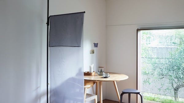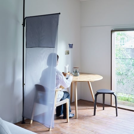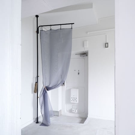 「Cloth Arm」の横幅約86.5cmのハンガーパイプは、程よいサイズの間仕切りに。透け感のあるカーテンを組み合わせれば、人の気配を感じながらも適度な距離をつくることができる。