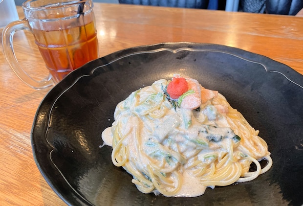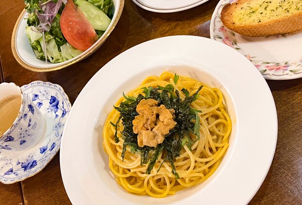お店のイチオシは「生ウニのクリームパスタ」。一口食べると、トロトロで濃厚なウニの味が口いっぱいに広がり、海苔とシソがさらにウニを引き立てます。ソースにもたっぷりとウニが入ったとても贅沢なパスタです。