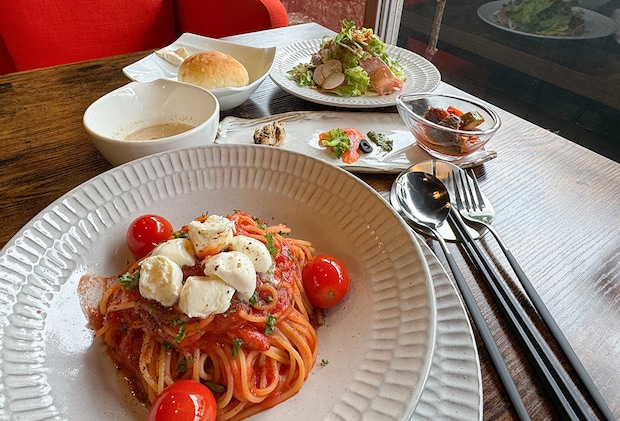 いちおしは好きなパスタが選べるパスタコース。モッツァレラチーズがたっぷりのった「トマトとモッツァレラのトマトソース」が人気。