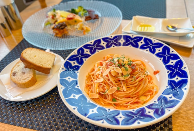 季節のパスタ2種類から選べるランチがおすすめ。「北海道産ホタテ貝のトマトソース」は、麺が細めでちゅるんとしてとても食べやすく、ほんのちょっとピリ辛で大人なトマトソース♪ホタテがゴロゴロ入っているから旨味もたっぷり!