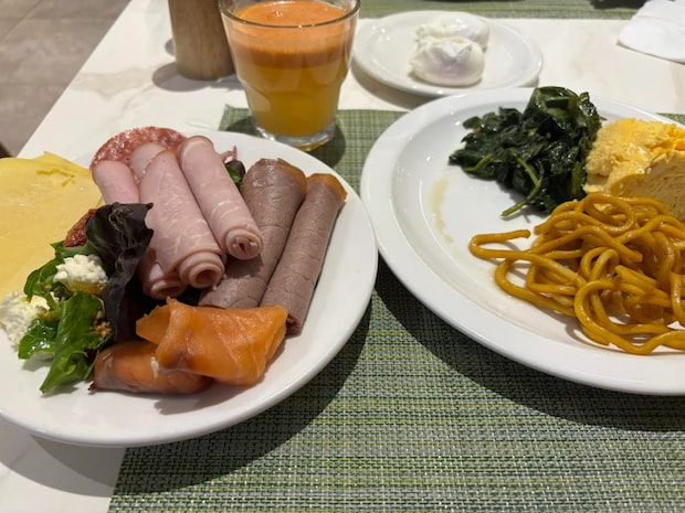 このホテルの朝食は、ベーカリー、パンケーキ、トーストやお好みの卵(オムレツ、スクランブルエッグ、ポーチドエッグ、ゆで卵)やサラダ、ハム、生ハム、ベーコン、チーズ、焼きそばなど要職をメインとしたビュフェットスタイルの朝食を選んで食べることができます。
