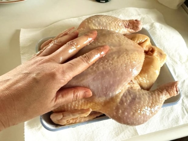 翌日、再度キッチンペーパーで水分を拭き取ったら、お腹の中にセロリの葉とにんにくを詰め、全体にオイルを塗ってなじませます。表も裏も、脚も手羽も、丁寧にすりすり。だんだん丸鶏のフォルムにも慣れてきた頃合いです。