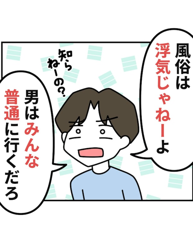 夫がスマホに届いた女性からのメッセージを「浮気じゃない」という理由は、風俗だからでした。その答えにさらにショックを受けるみゆきさん。しかし、夫は「男なら普通行くだろ」と自分のしたことは世間の常識だと言わんばかりに説明をしはじめます。