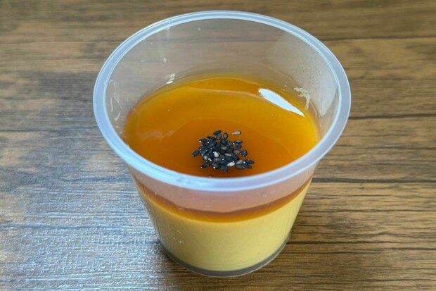 紅はるかを使用した濃厚なさつまいもプリンの上に、甘塩っぱいみたらしと黒胡麻をトッピングしています。