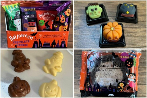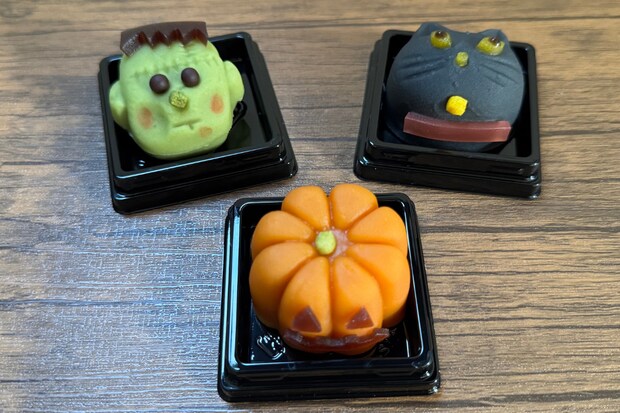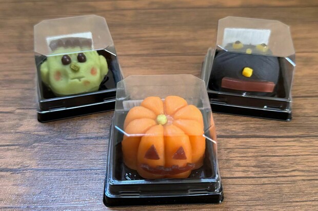 ハロウィンをイメージした楽しいパッケージのロールケーキ、黒猫をかたどった焼き菓子、モンスターをかたどった和菓子などなど。