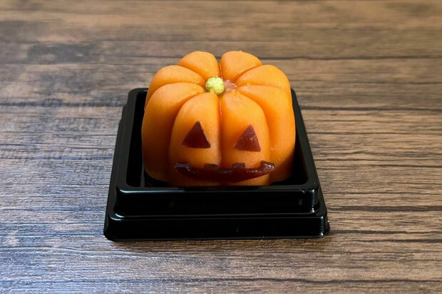 中の餡には、北海道美瑛産のかぼちゃを使用。可愛らしい目と口の部分は、小豆ようかんで表現されています。
