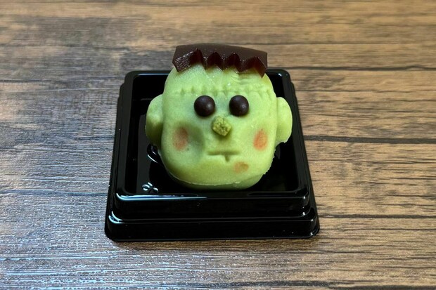 緑色に着色した「ねりきり餡」で、自家炊きの「こし餡」を包み込み、可愛らしいフランケンシュタインの姿を表現した一品。
