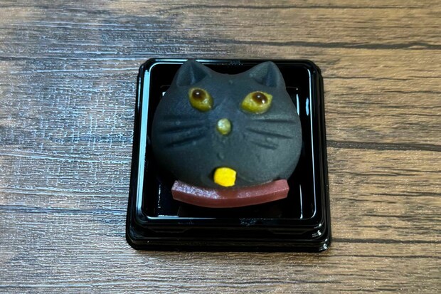 可愛らしい黒猫の形を表現。竹炭で黒く色付けした、しっとりとした「ねりきり餡」で、自家炊きの「白餡」を包んでいます。