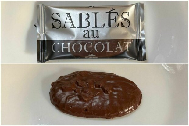 銀色のパッケージのサブレは、チョコクッキー生地にアーモンドを混ぜてスイートチョコをかけた「サブレ・オ・ショコラ(スイート)。
