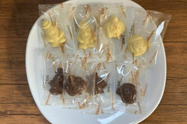 箱から取り出すと、かぼちゃ、おばけ、こうもり、ねこといった、ハロウィンモチーフのミルクとホワイトのチョコレートが8つ入っていました。