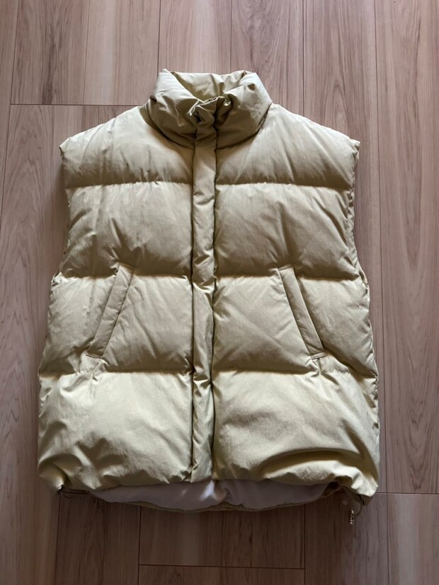 手持ちのダウンに文句はないのですが、電車やスーパーで着ていると「袖が邪魔だな~」と感じることもあって。その点、これはノーストレス。フリースや厚手のニットにプラスして、ヘビロテしています。ゆったりとした身幅とアームホールで羽織りやすいのも◎。ヒップまでしっかり隠れる長めの丈と、高めの襟も助かっています。セールで30%引きで買えたので、ラッキーでした。春先はTシャツに合わせて着たりもしたいです。
