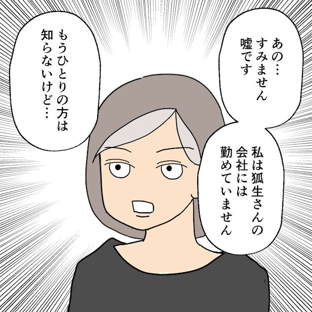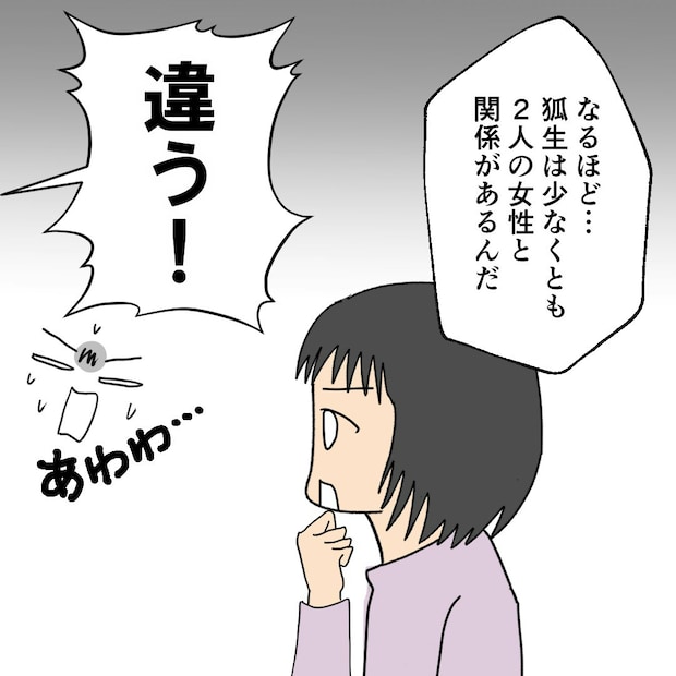 これ以上、ごまかせないと悟ったのか、同席していた女性は不倫関係を認めます。予想外の展開に、狐生はすっかり取り乱してしまいました。