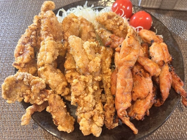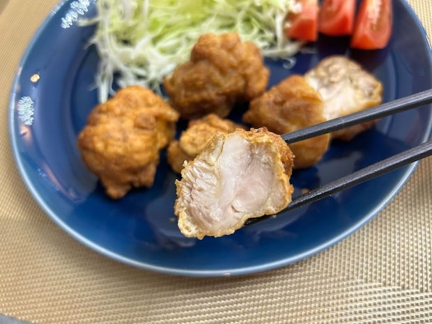 鶏もも肉を使っているので柔らかくとてもジューシー。衣は薄めで、小麦粉系です。衣が薄いので肉のジューシーさが際立ちます。