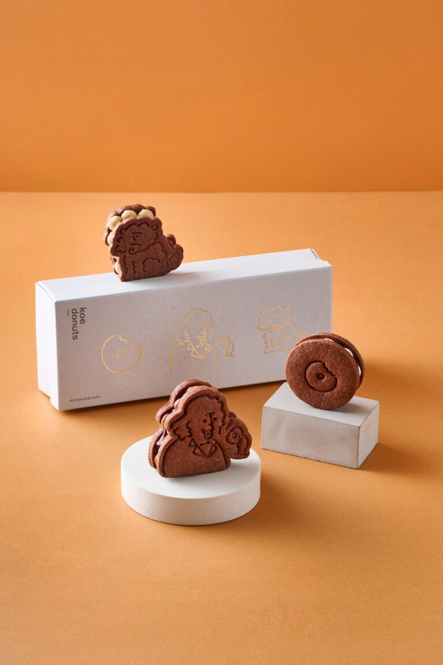 「オーガニック」「天然由来」「地産地消」をコンセプトに掲げるkoe donutsが、ブランド初となるキャラクターモチーフのお菓子を展開します。長場雄氏デザインの愛らしい『ドーナツ博士』『犬』『ドーナツ』の3キャラクターが、クッキーの形となって登場。クッキー缶にも使用している生地で、キャラクターたちを一つひとつ丁寧に焼き上げました。