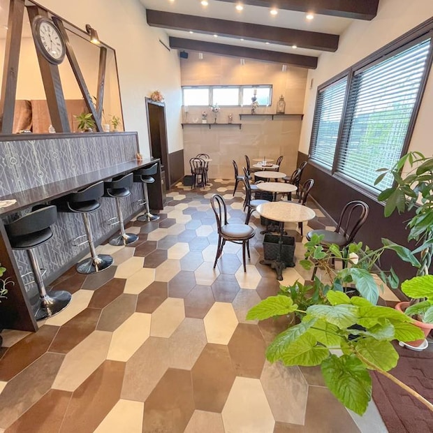 そして反対側には広々としたイートインスペースがあり、カウンター席とテーブル席がゆったりと設けられています。