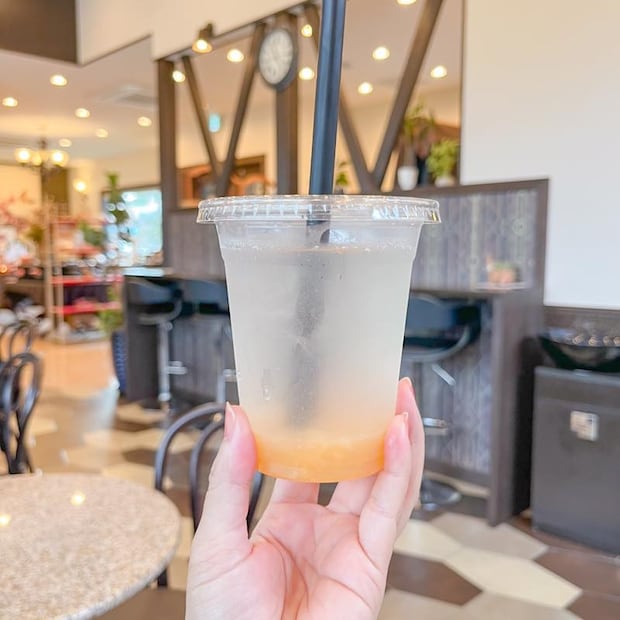 ピーチソーダは、桃の果肉がたっぷり入っていて飲むスイーツのよう♪