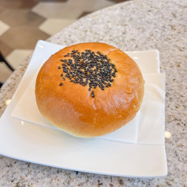 ゴマがたっぷりのった昔ながらの王道あんぱん。持つとずっしり重みがあります。