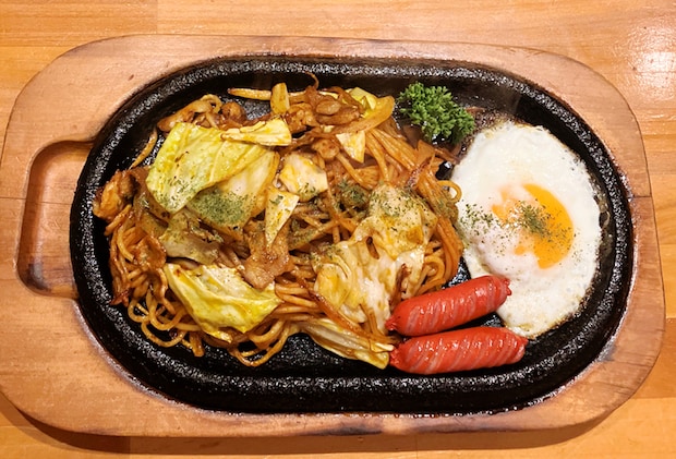 アツアツの鉄板の上にはドーンと焼スパ、目玉焼き、ウインナーソーセージが贅沢にのっています。