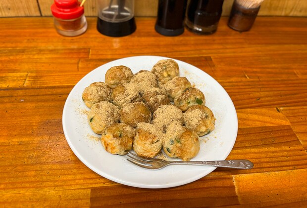 ころんとした丸いフォルムに魚粉がたっぷりかかった味覚焼はもちっと食感であっさり風味。