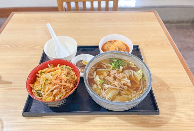 ホルモンうどんはほんのり甘いスープは焼肉のタレが使われていてホルモンやお野菜との相性抜群。