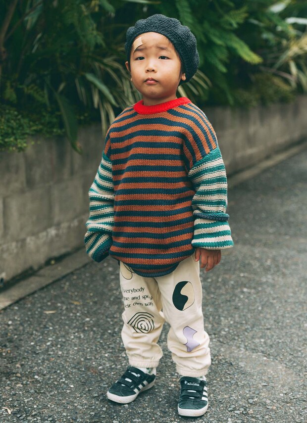 ストライプの袖切り替えがユニークなトップスに、やんちゃなプリントパンツを合わせて遊び心たっぷり♪トップスをちょっぴりオーバーサイズにすることで、バランスよく着こなしたえんくん。ざっくりとしたニットの質感がコーデに立体感をプラス。おでこの絆創膏も元気のしるしで、思わずキュンとするご愛嬌♡