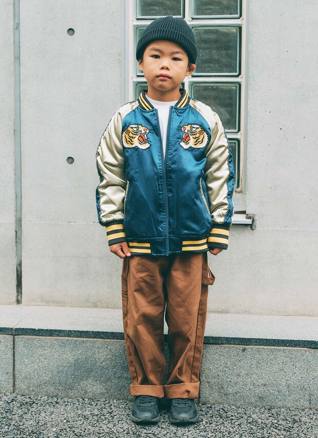 光沢のあるサテン素材に、トラの刺しゅうが映える『マーキーズ』のスカジャンを主役に、アメカジスタイルを堪能中のしきくん。ボトムはトレンド感もあるブラウンのカーゴパンツを合わせて、ほどよく今っぽさをプラス。仕上げに黒のビーニーをオンして全体をきれよく引き締めた大人っぽい着こなしに。