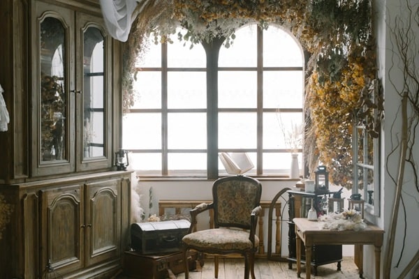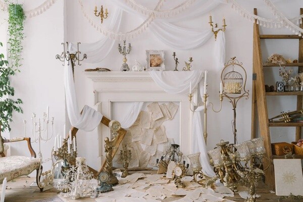 総面積70㎡超のゆとりある空間に、西洋より受け継がれたアンティーク家具を実際に配置し、心地よい自然光とドライフラワーがスタジオ全体を彩る。