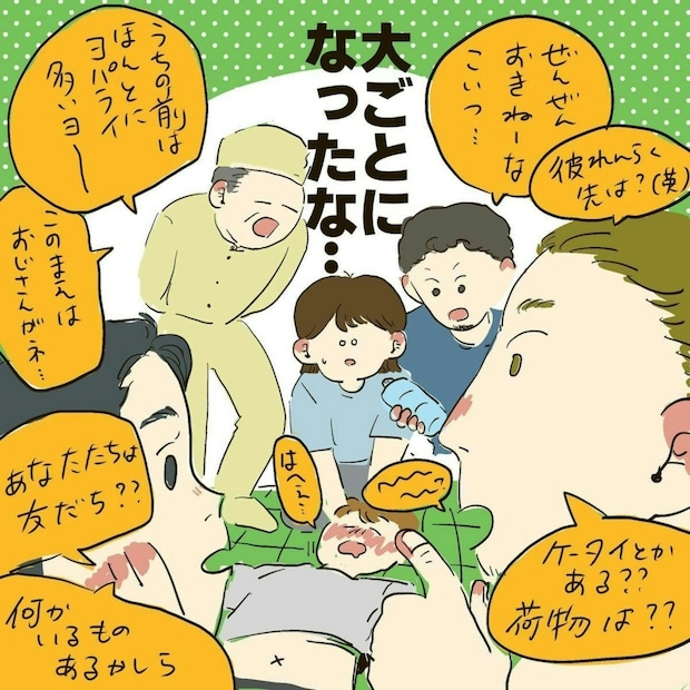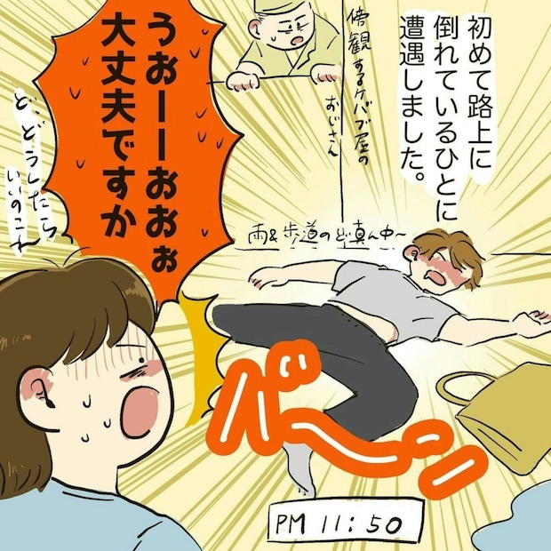 酔っ払って路上に倒れ込んでいる男性を見かけて、変貌ちゃん🍞ズボラめエッセイ漫画さんは1人でこの事態にパニックになっていたものの、気付けば周りに人が集まってひと安心。