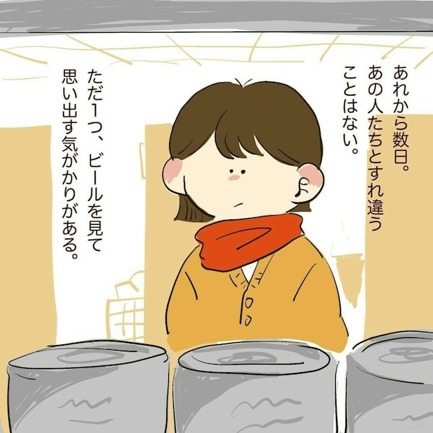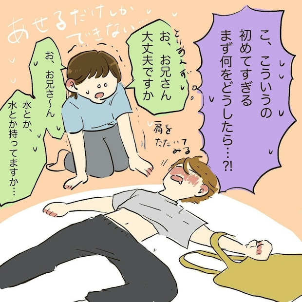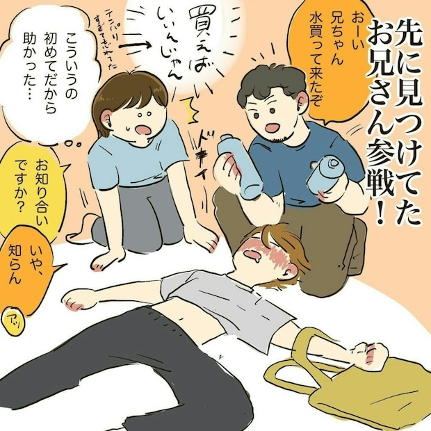 倒れている男性にどう対応していいか分からず不安が募る中、先に男性に気づいていたお兄さんが水を買って戻ってきてくれました。その姿を見て、変貌ちゃん🍞ズボラめエッセイ漫画さんは思わずホッとひと息。知り合いなのかと思いきや、お兄さんもたまたま通りがかっただけのようで、まったくの他人のようです。