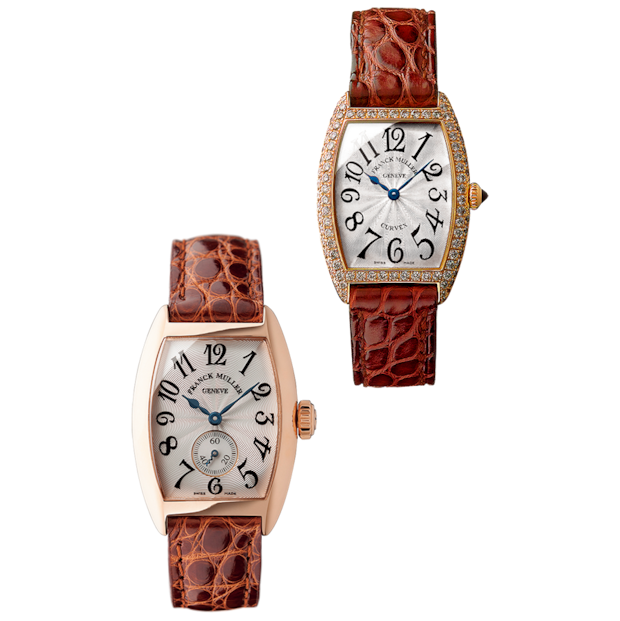 左からトノウ カーベックス[手巻き W25×H35㎜ K18PG]¥2,310,000、トノウ カーベックス ダイヤモンド [クォーツ W25×H35㎜ K18PG×DIA]¥3,740,000(共にフランク ミュラー/フランク ミュラー ウォッチランド東京)