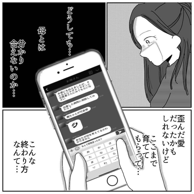 しかしある日、宅配便で「今までありがとうございました」と書かれた手紙とともに、実家にあったフォロワーさんの荷物が届きました。結局実母とはわかりあえず、涙を流しながら実母の連絡先を削除するフォロワーさん。