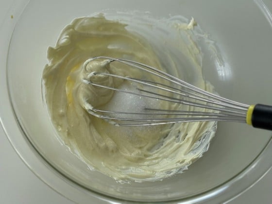 2. クリームチーズを室温に戻すか、耐熱容器に入れてラップをかけて600wの電子レンジに30秒ほどかけてやわらかくします。なめらかになるまで泡立て器で混ぜ、グラニュー糖の半量を加えてさらによく混ぜます。