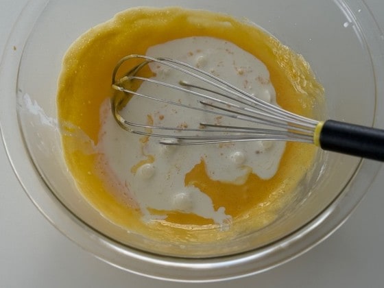 3. 工程2に卵黄、生クリームを順に加え混ぜます。