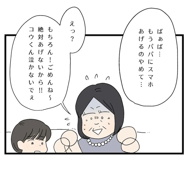 「ばぁば、もうパパにスマホあげるのやめて・・・」コウキくんは目に涙を浮かべながら、義母に訴えかけました。その姿に、義母は慌てて態度をガラリと変え、「えっ?もちろん!ごめんね~絶対あげないから!コウくん泣かないでぇ」と言いました。
