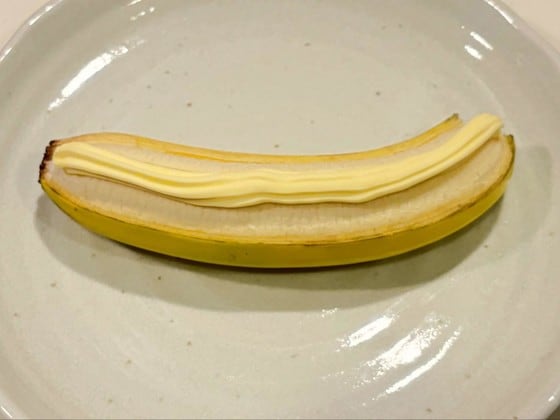 1.バナナの皮を半分だけむき、むいた部分全体にバターをのせます。