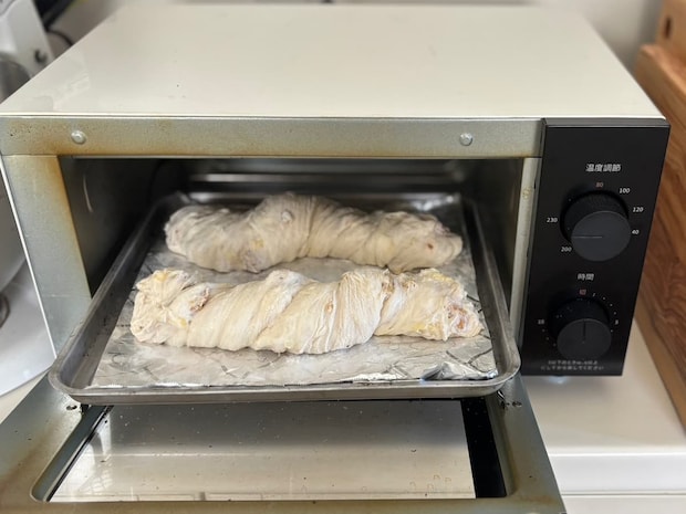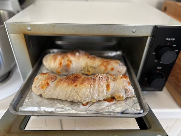1200Wのトースターで15分ほど焼く。表面が焦げそうな場合は、途中でアルミホイルをふんわりとかぶせる。裏面にも焼き色がついていれば焼き上がり。
